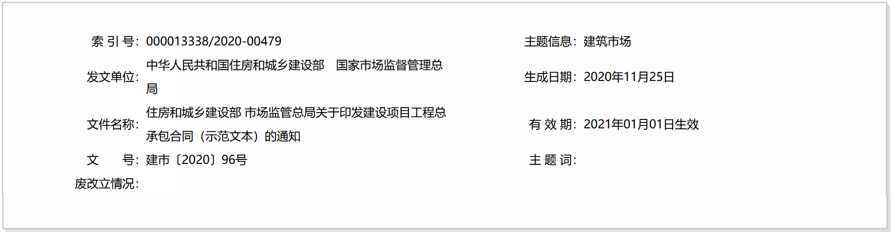 为促进建设项目工程总承包健康发展,维护工程总承包合同当事人的合法权益,住房和城乡建设部、市场监管总局制定了《建设项目工程总承包合同(示范文本)》(GF-2020-0216),现印发给你们,自2021年1月1日起执行。在执行过程中有任何问题,请与住房和城乡建设部建筑市场监管司、市场监管总局网络交易监督管理司联系。原《建设项目工程总承包合同示范文本(试行)》(GF-2011-0216)同时废止。