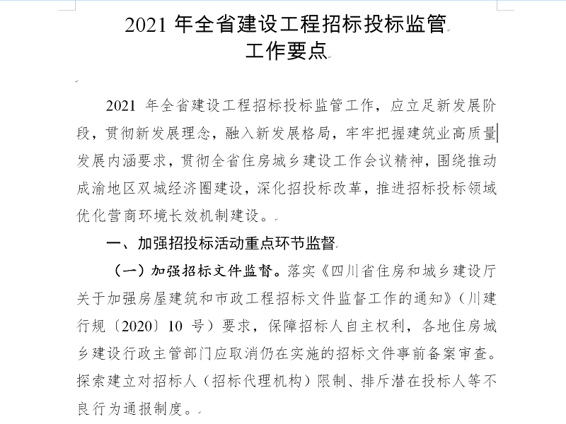 四川省住房和城乡建设厅关于印发《2021年全省建设工程招标投标监管工作要点》的通知