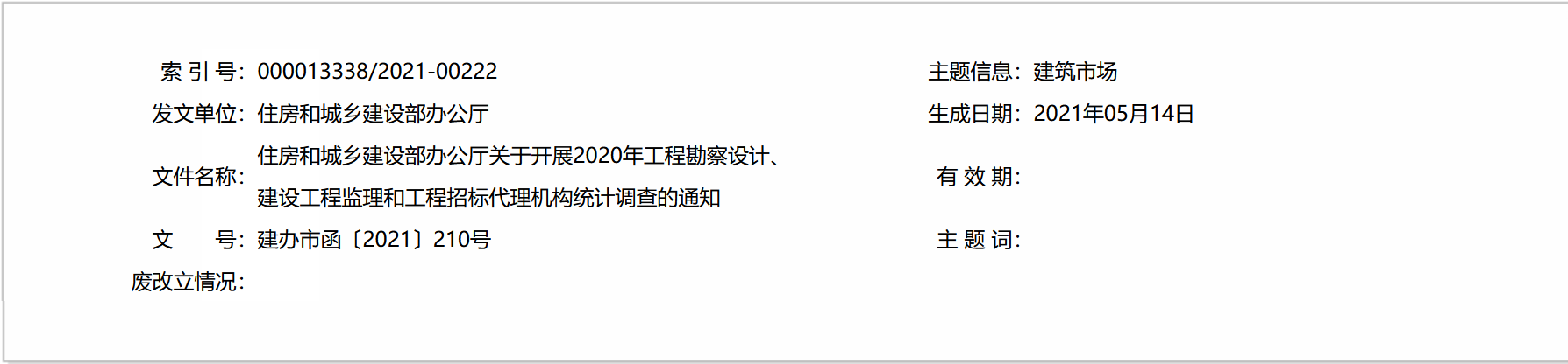 根据《国家统计局关于批准执行城市(县城)和村镇建设统计调查等两项统计调查制度的函》(国统制〔2021〕30号)、《国家统计局关于批准执行建设工程监理统计调查制度的函》(国统制〔2019〕4号)、《国家统计局关于批准执行工程招标代理机构统计调查制度的函》(国统制〔2019〕3号)要求,2020年全国工程勘察设计、建设工程监理、工程招标代理机构统计执行相关统计调查制度(见附件1、2、3,以下统称统计调查制度),现将有关事项通知如下:
